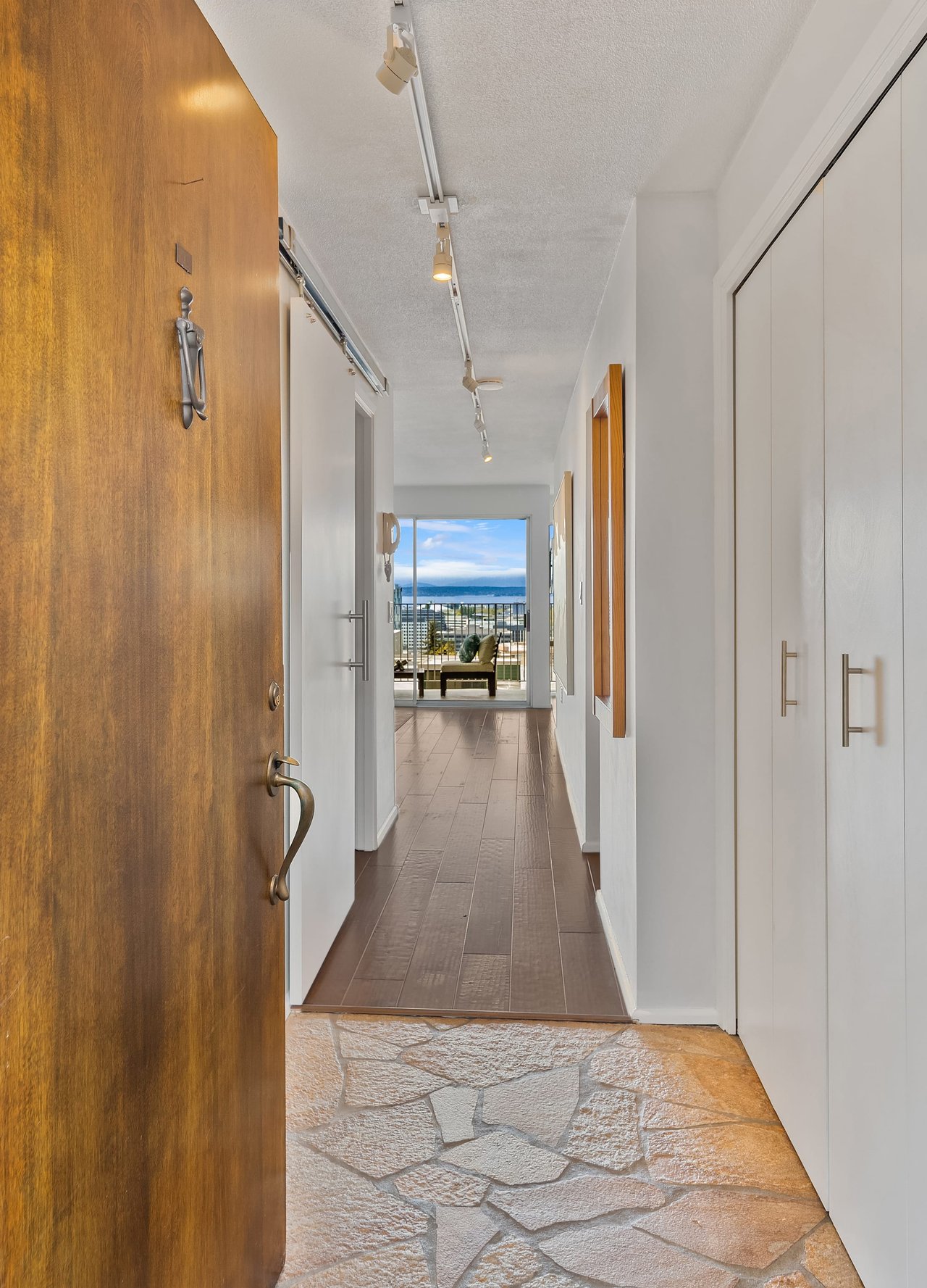 Step up to this mid-century sky crib with endless 180-degree sunset views. Your own private box seats for the city lights, Space Needle, Puget Sound, snow-capped Olympics & starburst fireworks. Swank around on the roomy balcony, or keep it indoors behind floor to ceiling walls of glass. Recent renovations bring sensitive updates to this resolutely modern flat in the 1965 concrete-and-steel Highlander. Updates include new hardwoods, a new bath (featuring the cool original tub), new closet doors throughout, fresh paint and an artfully refreshed mod kitchen. Secure garage parking. All on a quiet, leafy street on Capitol Hill's sunny west slope just 2 blocks to Broadway's bustle & a short walk to Pike/Pine, Downtown, SLU & legendary parks.