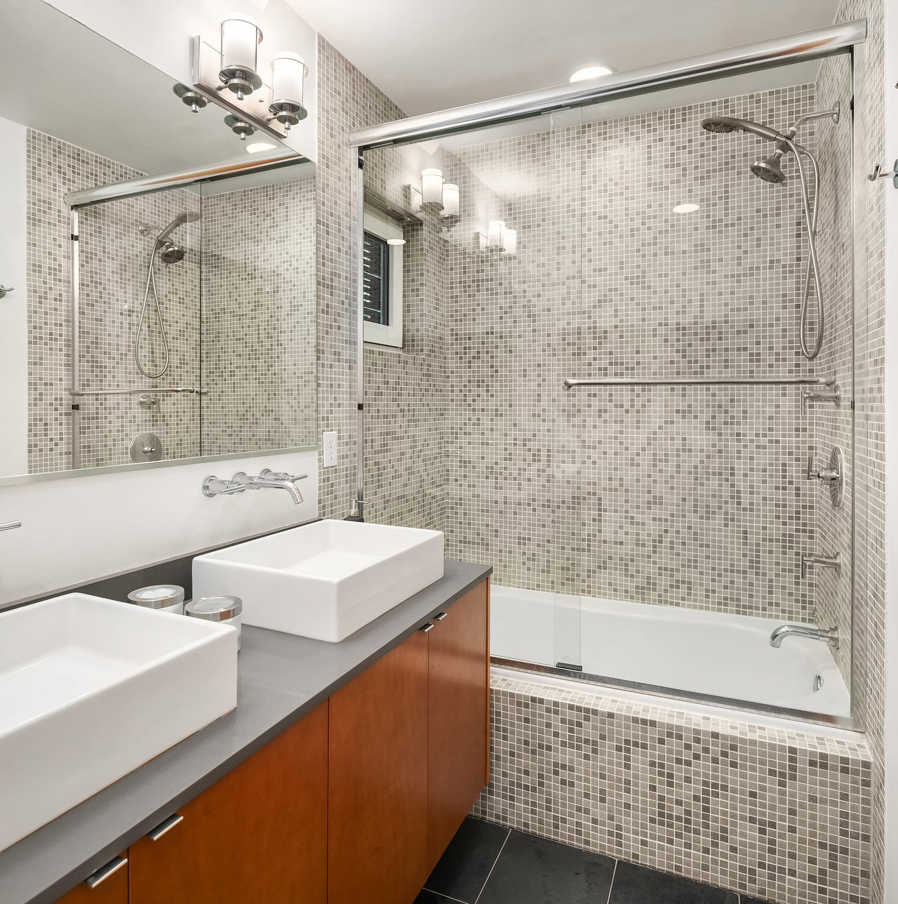 This one blends post-industrial elements (a steel grate entry catwalk, polished concrete floors) with custom green-built elements like the reclaimed slab fir vanity.