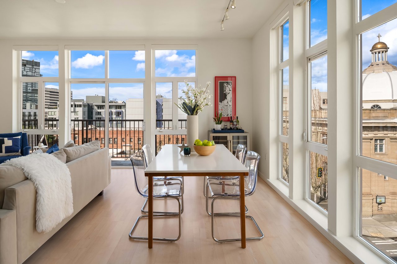This airy corner unit high above the streets only shares one wall with a neighbor. In-unit laundry, secure garage parking and free-standing AC with custom window insert all included. Primo Pike/Pine locale! Walkscore 99. No rental cap.